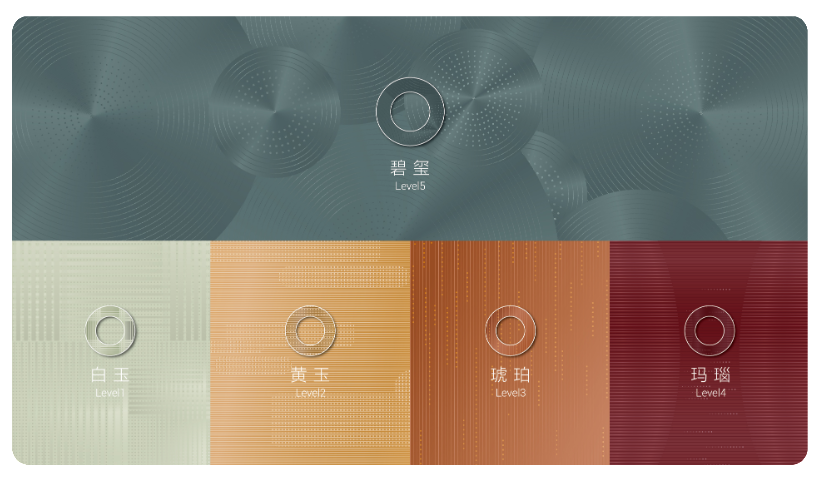 “一合”大会员体系等级划分取自佛教宝物之一——“玉”的不同类别,以“碧玺”为首,依次设立“玛瑙”、“琥珀”、“黄玉”、“白玉”五个级别,会员可通过在合景泰富集团旗下各业态的消费获得成长值,开启“君子之旅”。
