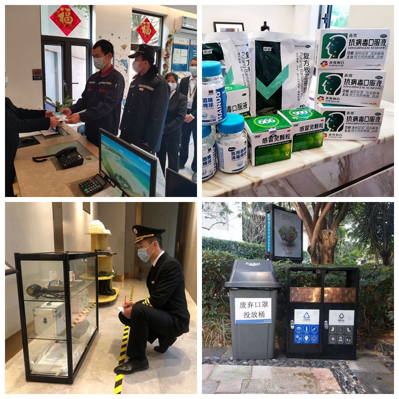 对于高频次、近距离接触客户的社区岗位人员,如服务中心前台、卡口、销售中心等,公司将为其统一配备酒精消毒液或免洗洗手液,以保障员工与业主的安全。物业服务中心增设专门的便民防疫物资点,供有需要的住户前往领取使用。此外,社区中还设置了废弃口罩投放箱,以集中处理使用过的一次性医疗防护物品。