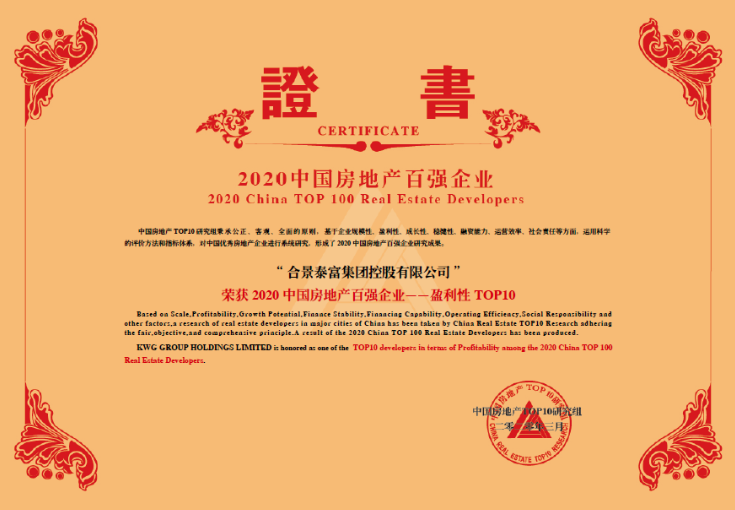 合景泰富集团荣膺“2020年中国房地产百强企业——盈利性TOP10”