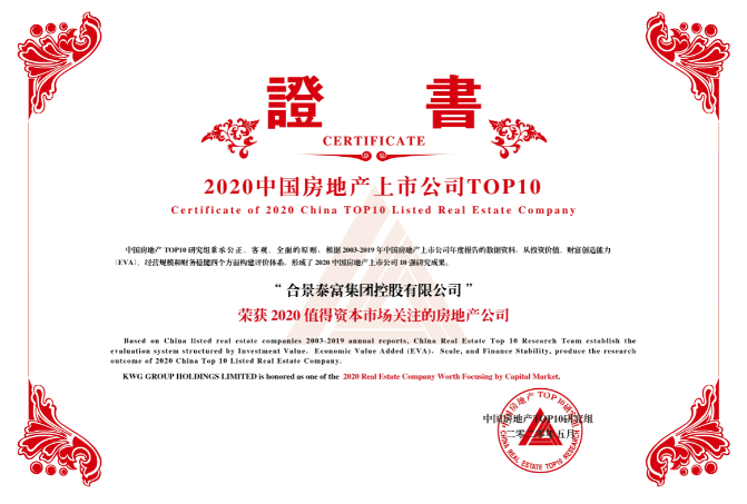 2020年5月13日,由中国房地产TOP10研究组主办、中指控股(CIH)、中指研究院承办的“2020中国房地产上市公司研究成果发布会暨第十八届中国房地产投融资大会”于线上隆重举行。合景泰富集团(HK.1813)凭借出色的综合运营实力、稳健向好的财务表现、较强的盈利能力、多元协同的发展布局,蝉联“2020中国大陆在港上市房地产公司综合实力TOP10”,位列第9名;同时,还荣获“2020值得资本市场关注的房地产公司”殊荣。