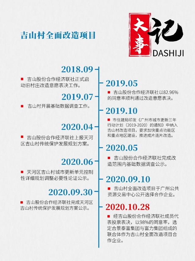 2020年10月28日,广州市天河区珠吉街吉山村于吉山村委三楼大会议室举行村民代表大会,公开表决选择吉山村全面改造项目合作企业。合景泰富集团与富力集团联手竞投,以98%的同意率通过表决,成为吉山村全面改造项目合作企业。此次改造将以建设“精品吉山”为目标,服务广深港澳科技创新走廊节点,围绕智谷山水宜居社区与珠吉历史文脉走廊建设,构筑广州东产城融合典范。