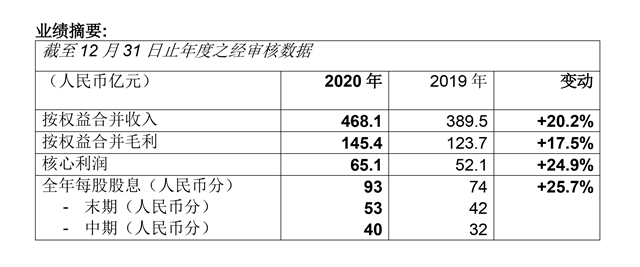 2020年,合景泰富集团按权益合并收入约人民币468.1亿元,较2019年增长20.2%;按权益合并毛利约人民币145.4亿元,同比增长17.5%;核心利润约人民币65.1亿元,同比增长24.9%。董事会宣布派发截至2020年12月31日止年度之末期股息每股人民币53分,连同2020年中期派息每股人民币40分,全年共派息人民币93分,同比增长25.7%,派息率为45.4%。