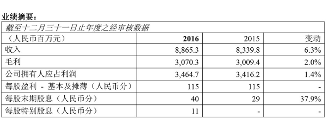 During the year under review, KWG Property’s revenue amounted to approximately RMB 8.87 billion, representing an increase of 6.3% from that for the same period in 2015. The gross profit amounted to approximately RMB 3.07 billion, representing an increase of 2.0% from that for the same period in 2015. The gross profit margin remained stable at 34.6%. The profit attributable to the owners of the Company was approximately RMB 3.46 billion. The core profit amounted to approximately RMB 2.92 billion, representing a year-on-year increase of 12.6%. The earnings per share were RMB 115 cents. The Board proposed a payment of a final dividend of RMB 40 cents per share for the year ended 31 December 2016, along with a special dividend of RMB 11 cents per share.