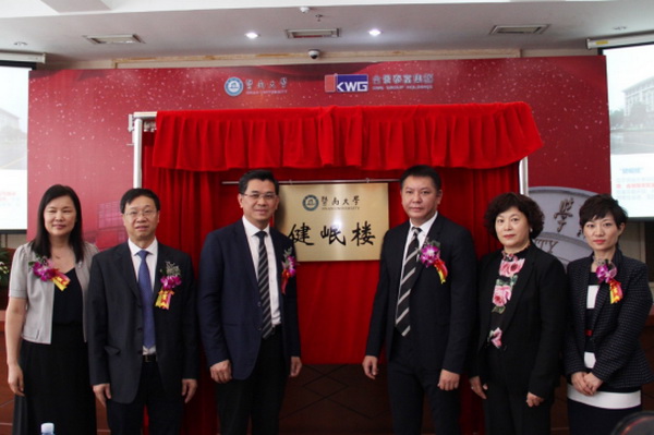 Mr. Kong Jianmin, the Chairman of the board of directors of KWG Group and the member of the school board of Jinan University, Ms. Li Guije, director of KWG Group, Ms. Kuang Xiaoling, executive director of KWG Education Group, senior management of KWG Group, Professor Lin Rupeng, secretary of the Communist Party of Jinan University, Professor Song Xianzhong, principal, Professor Hongan, vice principal as well as persons-in-charge of relevant departments, branches and faculties participated in the ceremony.